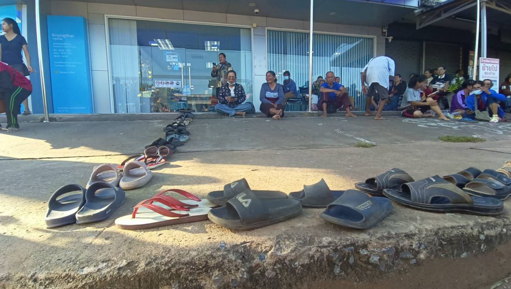 ชัยภูมิ ชาวบ้านแห่นำรองเท้าวางเรียงแถวจองคิว คนละครึ่งพลัสยาวเหยียดแน่นธนาคาร ที่หน้าธนาคาร กรุงไทย อ.หนองบัวระเหว แต่เช้ามืด ยาวกว่า150 เมตร หวังให้เจ้าหน้าที่ช่วยโหลดแอปฯ เป๋าตัง และสแกนใบหน้า เพื่อรอลงทะเบียนโครงการคนละครึ่งพลัสในวันนี้