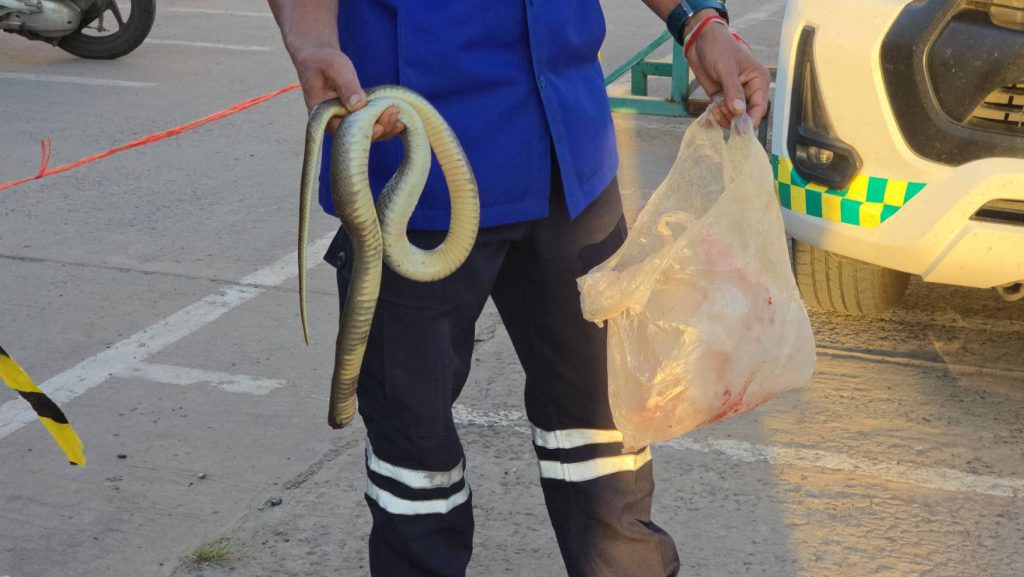 “ตอนนั้นตกใจมาก แต่พอรู้ว่าโดนพิษงูแน่ๆ ก็รีบล้างตาด้วยน้ำสะอาดเท่าที่หาได้ แล้วใช้เสียมตีงูตายไว้ ก่อนโทรเรียกกู้ชีพมาช่วย” นายทีกล่าว