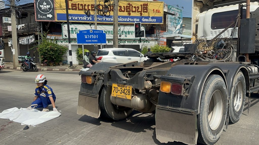 อำเภอนางรอง/รถจอดรอไฟแดงบีบแตรระเสียงดังสนั่นกลางสี่แยก หลังเห็นรถสิบล้อหัวลากกำลังเคลื่อนเหยียบรถมอเตอร์ไซค์ที่จอดอยู่หน้ารถแต่คนขับไม่เห็นสิบล้อค่อยๆทับรถและร่างคนจนหัวขาดสยดสยองต่อหน้าผู้ใช้รถใช้ถนน แม่สามีคนตายเผยลูกสะใภ้ ออกจากบ้านไปรอยืนยันตัวตนกับโครงการคนละครึ่ง 2 รอบ รอบนี้โชคร้าย