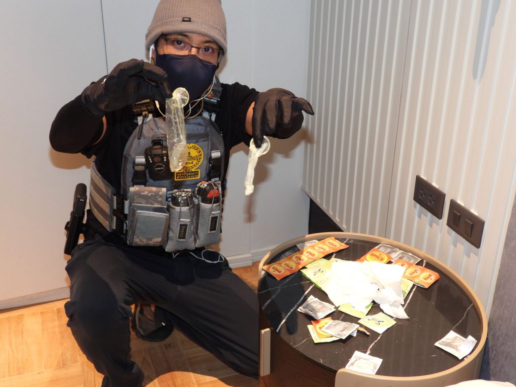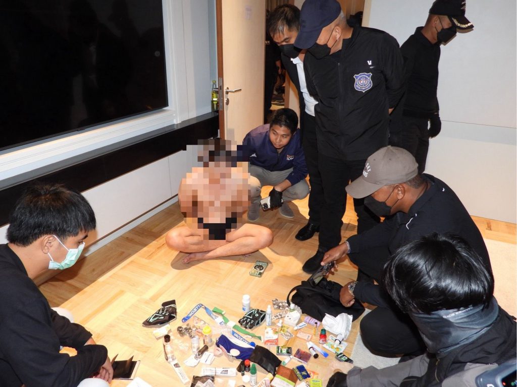 เจ้าหน้าที่เข้าตรวจค้นห้องสูทภายในโรงแรม พบชายจำนวน 29 คน เป็นคนไทย 28 คน และชาวฟิลิปปินส์ 1 คน อยู่ในสภาพเปลือยกาย มีอาการมึนเมาและกำลังมั่วสุมในหลายห้อง ตรวจค้นพบของกลางจำนวนมาก ทั้งยาไอซ์ ยาบ้า ยาอี เคตามีน ยาอีน้ำ ไวอากร้า ยาป๊อปเปอร์กว่า 30 ขวด เข็มฉีดยา อุปกรณ์เสพยา ถุงยางอนามัย และเจลหล่อลื่นกระจัดกระจายทั่วห้อง