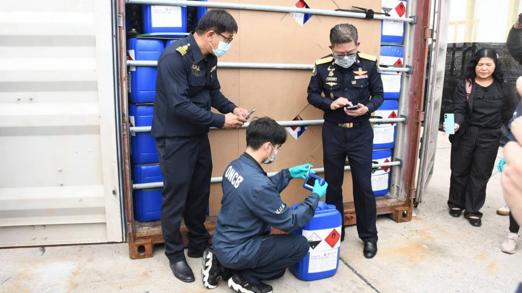 ชลบุรี บุกสกัดเคมีอันตราย 22 ตัน! ป.ป.ส.–ศุลกากร–ดีอี–ปส. ผนึกกำลังยึด ‘กรดอะซีติก’ ล็อตใหญ่ ปิดเส้นทางผลิตยาบ้า–ไอซ์–เฮโรอีน มูลค่ามหาศาล ที่ท่าเรือแหลมฉบัง