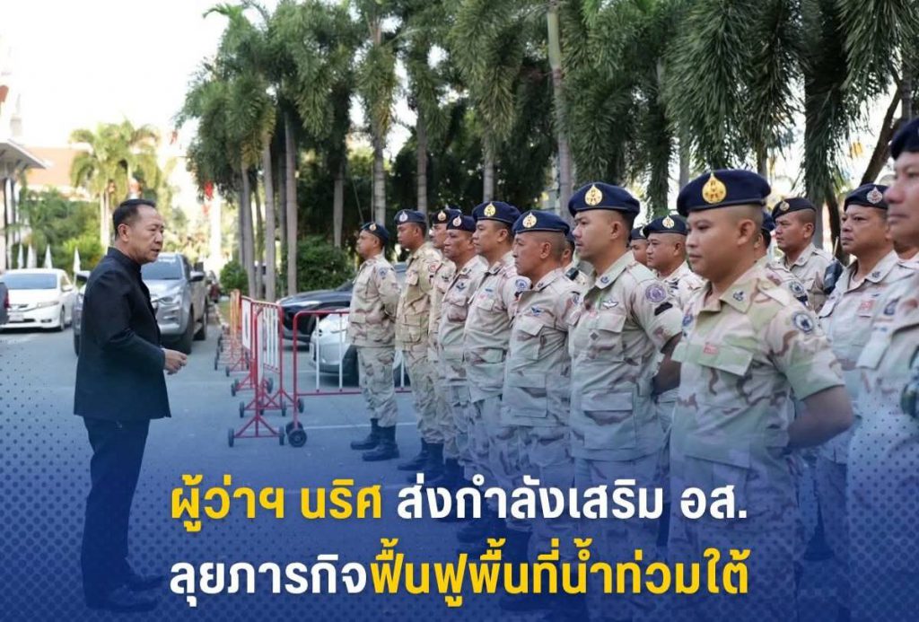นายนริศ นิรามัยวงศ์ผู้ว่าราชการจังหวัดชลบุรีได้แสดงความเป็นห่วงและให้ความร่วมมือช่วยเหลือพี่น้องประชาชนในพื้นที่ภาคใต้ที่ประสบอุทกภัยอย่างต่อเนื่องล่าสุดในเช้าวันนี้ได้ส่งกำลังพล อาสารักษาดินแดน (อส.) ชุดใหม่ จำนวน 24 ราย ลงพื้นที่เพิ่มเติม เพื่อสนับสนุนภารกิจบรรเทาทุกข์และฟื้นฟูหลังน้ำลดการส่งกำลังเสริมในครั้งนี้ ทำให้ยอดรวมกำลัง อส. จากชลบุรีที่ถูกส่งไปช่วยเหลือผู้ประสบภัยในพื้นที่ภาคใต้แล้วมีทั้งสิ้น 36 รายก่อนออกเดินทางผู้ว่าราชการจังหวัดชลบุรีได้มอบนโยบายการทำงานโดยเน้นย้ำให้ปฏิบัติหน้าที่อย่างเต็มกำลังความสามารถ คำนึงถึงความปลอดภัยพร้อมกล่าวให้กำลังใจเจ้าหน้าที่ทุกคนที่เสียสละไปปฏิบัติงานในครั้งนี้