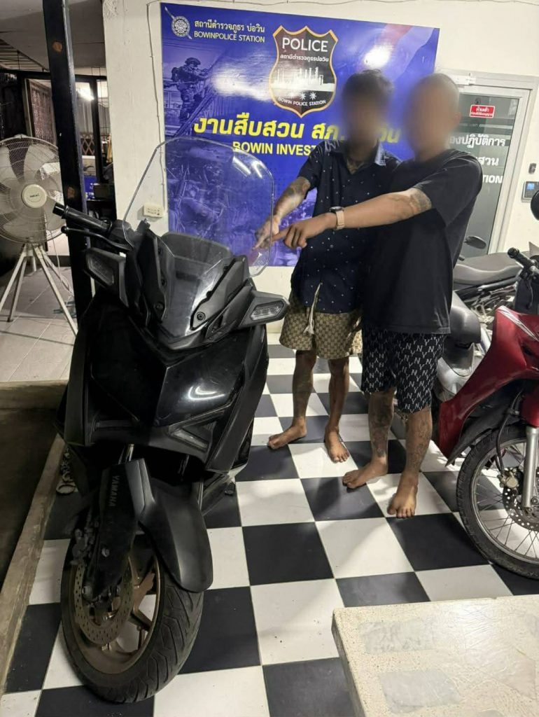 ชุดสืบสวน สภ.บ่อวินภายใต้การอำนวยการของ พ.ต.อ.กฤศ ธิติทัศนะ ผกก.สภ.บ่อวิน โดยมี พ.ต.ท.สมคิด ยานะพันธ์ รอง ผกก.สส. และ พ.ต.ท.วีระ วัฒนาณรงค์ชัย สว.สส. นำกำลังออกสืบสวนหลังได้รับร้องเรียนเหตุลักรถจักรยานยนต์หลายครั้งในพื้นที่ กระทั่งพบผู้ต้องหาเป็นกลุ่มวัยรุ่นที่เพิ่งได้รับการประกันตัวจากคดีลักรถแต่ยังกลับมาก่อเหตุซ้ำจึงเร่งวางแผนติดตามและสามารถจับกุมตัวผู้ต้องหาทั้ง 3 รายได้ คือ นายธีรพล อายุ 23 ปี ชาวอำเภอนิคมพัฒนา จังหวัดระยอง นายวรชาติ อายุ 18 ปี ชาวตำบลบ่อวิน อำเภอศรีราชา จังหวัดชลบุรี และนายปิยะวัตร อายุ 16 ปี ชาวอำเภอน้ำโสม จังหวัดอุดรธานี ซึ่งทั้งหมดให้การรับสารภาพว่าเพิ่งพ้นประกันตัวออกมาและร่วมกันตั้งแก๊งลักรถสร้างความเดือดร้อนให้ประชาชน