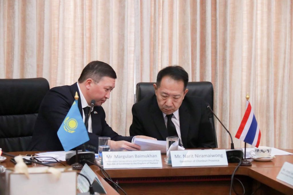 นายนริศ นิรามัยวงศ์ ผู้ว่าราชการจังหวัดชลบุรี ได้ให้การต้อนรับ มาร์กูลัน ไบมูคันเอกอัครราชทูตวิสามัญผู้มีอำนาจเต็มแห่ง สาธารณรัฐคาซัคสถาน ประจำราชอาณาจักรไทยในโอกาสเข้าพบ เพื่อหารือแนวทางกระชับความสัมพันธ์และความร่วมมือระหว่างกันในหลายมิติ ทั้งประเด็นความร่วมมือด้านการค้าและการลงทุน การท่องเที่ยว การแลกเปลี่ยนด้านการศึกษา รวมถึงการสร้างเครือข่ายความร่วมมือในระดับจังหวัด ณ ห้องรับรองผู้ว่าราชการจังหวัดชลบุรี ชั้น 2 ศาลากลางจังหวัดชลบุรี
