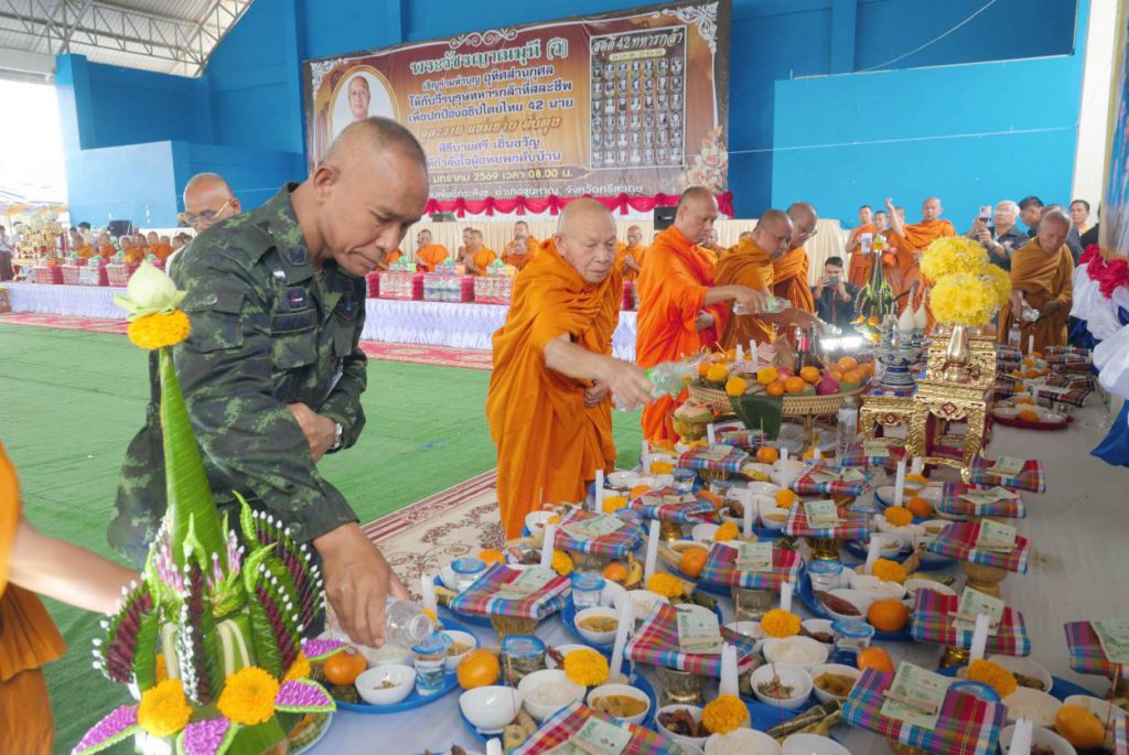 เมื่อวันที่ 16 ม.ค. 2569 ผู้สื่อข่าวรายงานว่า วานนี้ (15 ม.ค. 69) ที่เทศบาลตำบลโพธิ์กระสังข์ อ.ขุนหาญ จ.ศรีสะเกษ พระวัชรญาณมุนี(วิ) เจ้าอาวาสวัดเทพสรธรรมาราม (บาย ตึ๊ก เจีย) จ.ปทุมธานี ได้รับความเมตตาจากพระวชิรสิทธิธาดา เจ้าคณะจังหวัดศรีสะเกษ เป็นประธานฝ่ายสงฆ์ พล.ต.ณัฏฐ์ ศรีอินทร์ รองแม่ทัพภาคที่ 2 เป็นประธานในพิธี และมี หม่อมหลวงปิยาภัสร์ ภิรมย์ภักดี พร้อมด้วย นายสุกิจ เหลืองสกุลไทย รอง ผวจ.ศรีสะเกษ และนายศดิศ ณิชกุล นายอำเภอขุนหาญ นำข้าราชการและชาวบ้านในพื้นที่ร่วมกันประกอบพิธีทำบุญอุทิศส่วนกุศลให้แก่ วีรบุรุษทหารกล้า 42 นาย ที่สละชีพเพื่อปกป้องอธิปไตยของชาติ จากการสู้รบกับทหารกัมพูชา ในช่วงระหว่างวันที่ 24 ก.ค. 2568 ถึง วันที่ 27 ธ.ค. 2568 ที่ผ่านมา