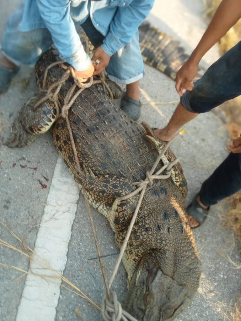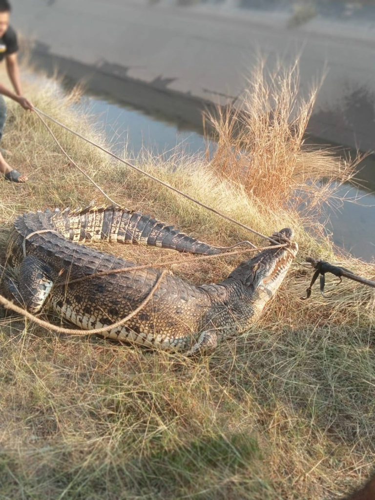 จากการสอบถาม นายต้น ชาวบ้านผู้พบเห็นจระเข้เป็นคนแรก เล่าว่า ขณะขี่รถจักรยานยนต์เลาะคลองเพื่อหาจุดตกปลา สังเกตเห็นวัตถุคล้ายท่อนไม้สีดำลอยอยู่ในน้ำ เมื่อเข้าไปดูใกล้ ๆ จึงรู้ว่าเป็น จระเข้ตัวใหญ่ จึงรีบเรียกชาวบ้านที่ผ่านมาช่วยกันจับขึ้นจากคลองชาวบ้านได้ใช้เชือกเป็นอุปกรณ์ในการจับ ใช้เวลาไม่นานก็สามารถนำจระเข้ขึ้นมาบนฝั่งได้อย่างปลอดภัย ตรวจสอบพบว่าจระเข้มีความยาวประมาณ 2 เมตร น้ำหนักกว่า 100 กิโลกรัม