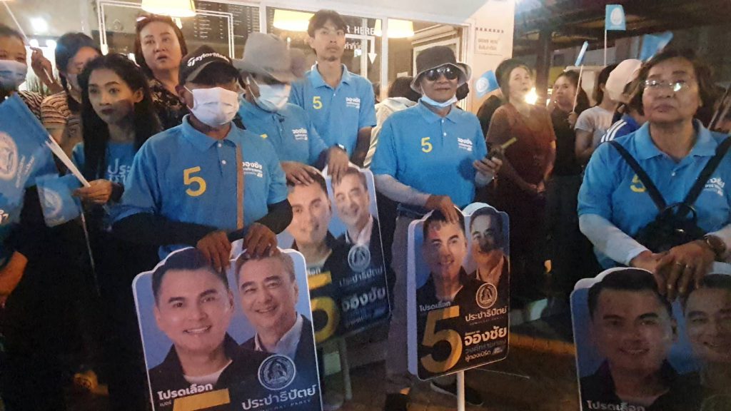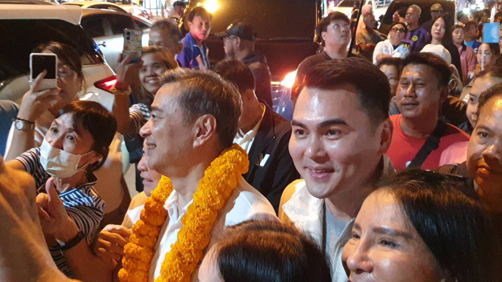 อภิสิทธิ์ เวชชาชีวะ ลงพื้นที่ตลาดวิสิทย์ชัย.จังหวัดชลบุรีช่วยผู้สมัคร ส.ส. พรรคประชาธิปัตย์ หาเสียงชูสานต่อเบี้ยผู้สูงอายุ 1,000 บาท