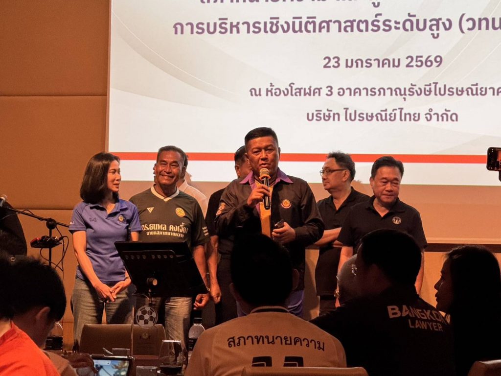ดร.ธนพล คงเจี้ยง นายกสภาทนายความในพระบรมราชูปถัมภ์ เป็นประธานในพิธีเปิดการแข่งขันฟุตบอลกระชับมิตรของผู้เข้ารับการอบรมหลักสูตรการบริหารเชิงนิติศาสตร์ระดับสูง รุ่นที่ 1–5 (วทน.1–5) ณ สนามฟุตบอลบริษัท ไปรษณีย์ไทย จำกัด ถนนแจ้งวัฒนะ เมื่อวันศุกร์ที่ 23 มกราคม 2569 ที่ผ่านมา