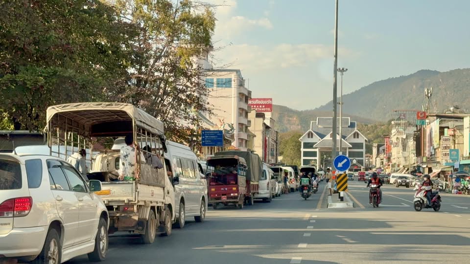 แม่สาย ร่วมกว่า 400 คัน รถสกายแลปสามล้อแดง รถตู้ขนส่งสินค้า รถ 4 ล้อเล็ก ที่เป็นรถรับจ้างเมียนมา วิ่งขับขี่กัน ขวักไขว่ จ้าละวัน