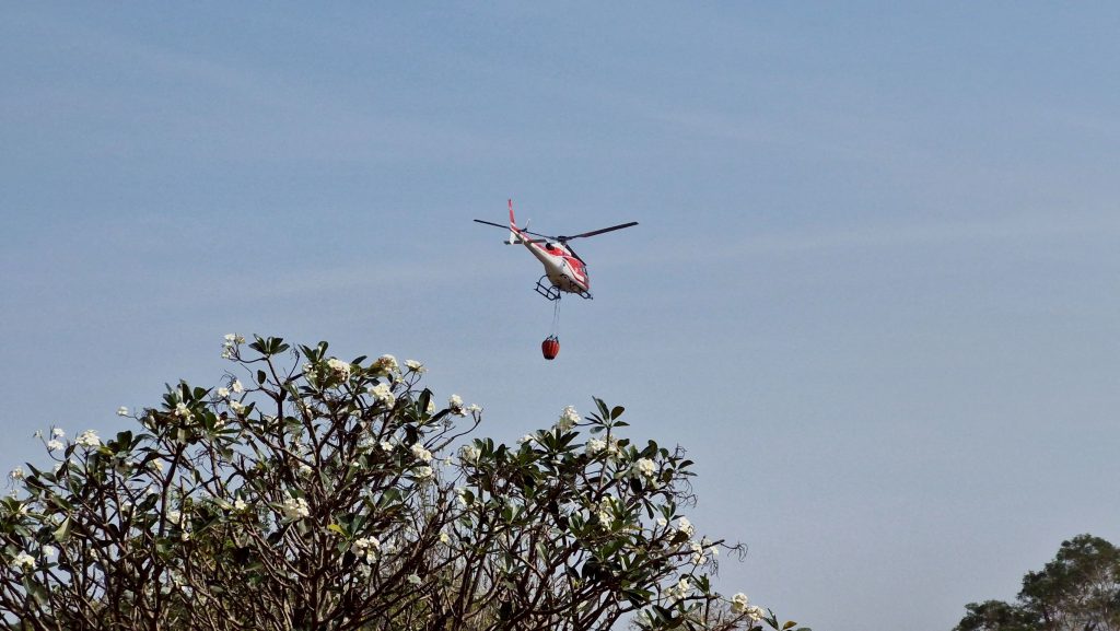 โดยวันนี้เจ้าหน้าที่ได้นำเฮลิคอปเตอร์ติดกระเช้าตักน้ำจากกระทรวงทรัพยากรธรรมชาติและสิ่งแวดล้อม จำนวน1ลำ ออกบินสำรวจพื้นที่ปฏิบัติการช่วยเหลือดับไฟป่า เฮลิคอปเตอร์ติดกระเช้าได้ตักน้ำกว่า 20 เที่ยวจากแหล่งน้ำใกล้เคียงเข้าช่วยเหลือดับไฟป่าในพื้นที่ พร้อมนำกำลังเจ้าหน้าที่ไฟป่าและอุทยาน เดินเท้าเข้าพื้นที่ทำแนวกันไฟเพื่อิป้องกันไม่ให้ไฟป่าลุกลามไปมากกว่านี้