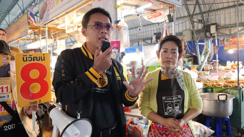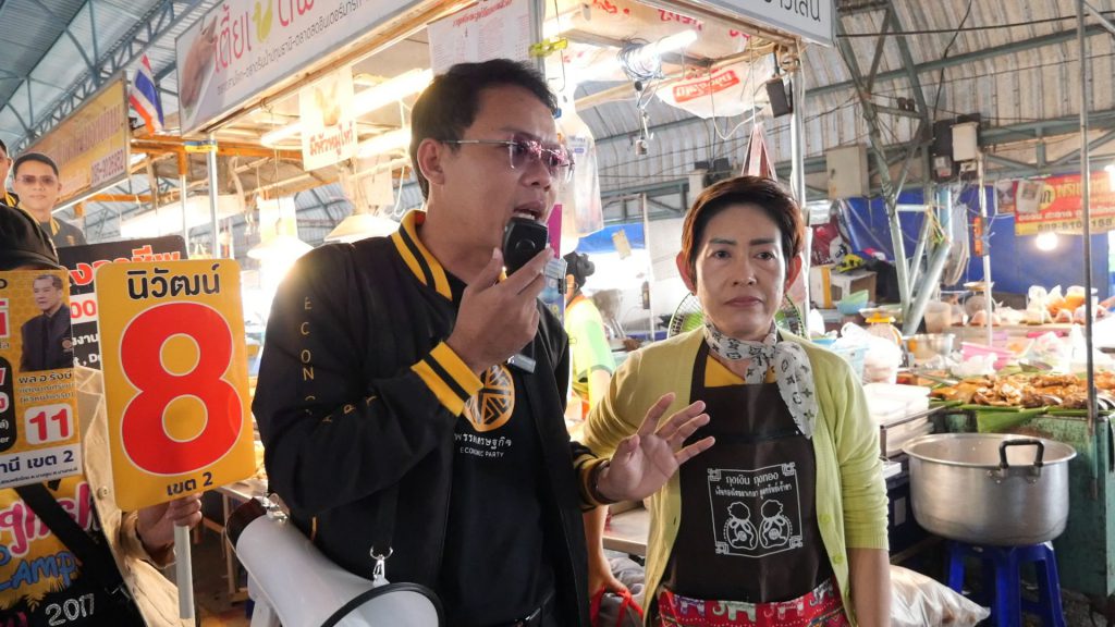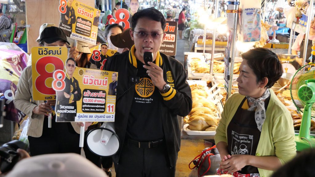 ผู้สื่อข่าวรายงานบรรยากาศโค้งการหาเสียงเลือกตั้ง ส.ส. จังหวัดปทุมธานี เขต 2 ที่กำลังเข้มข้นถึงขีดสุด โดยสปอร์ตไลท์จับจ้องไปที่ **นายนิวัฒน์ บุปผามาโล ผู้สมัคร ส.ส. หมายเลข 8 พรรคเศรษฐกิจ** ซึ่งถือฤกษ์ดีนำทีมงานลงพื้นที่บุกตลาดสดใจกลางปทุมธานี เพื่อพบปะพี่น้องประชาชน พ่อค้าแม่ค้า แบบถึงลูกถึงคน