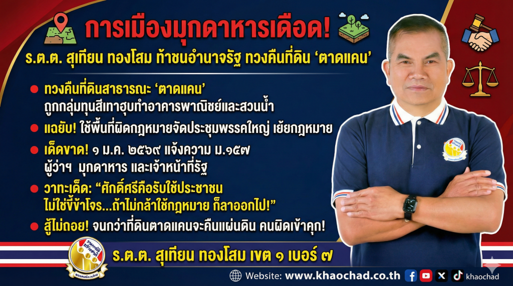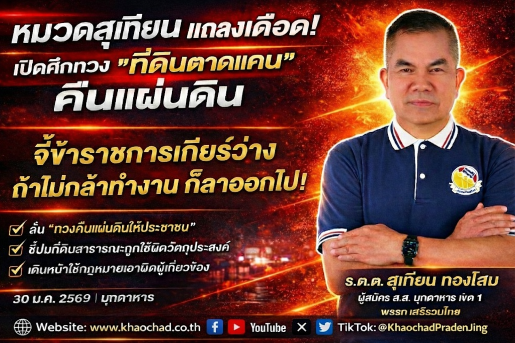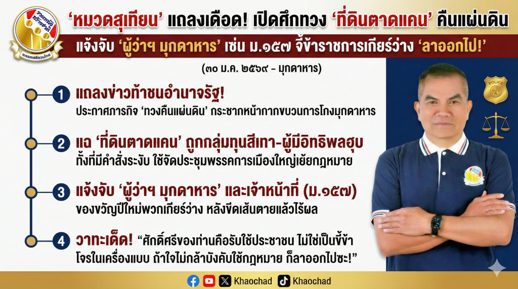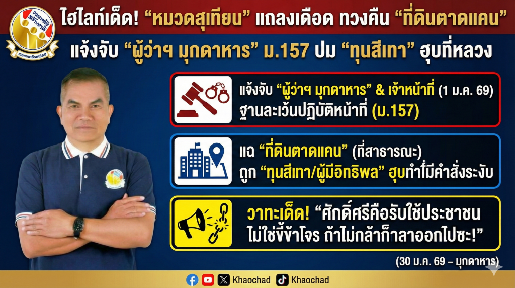 “หมวดสุเทียน” แถลงเดือด! เปิดศึกทวง “ที่ดินตาดแคน” คืนแผ่นดิน แจ้งจับ “ผู้ว่าฯ มุกดาหาร” เซ่น ม.๑๕๗ จี้ข้าราชการเกียร์ว่าง “ลาออกไป!”