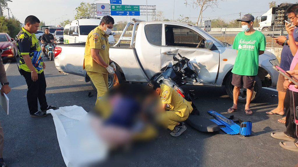 กระบะออกจากซอย ชน จยย.ทางตรง ด.ช.ม.3 ดับ คนขับอ้างถูกพุ่มไม้บังสายตา