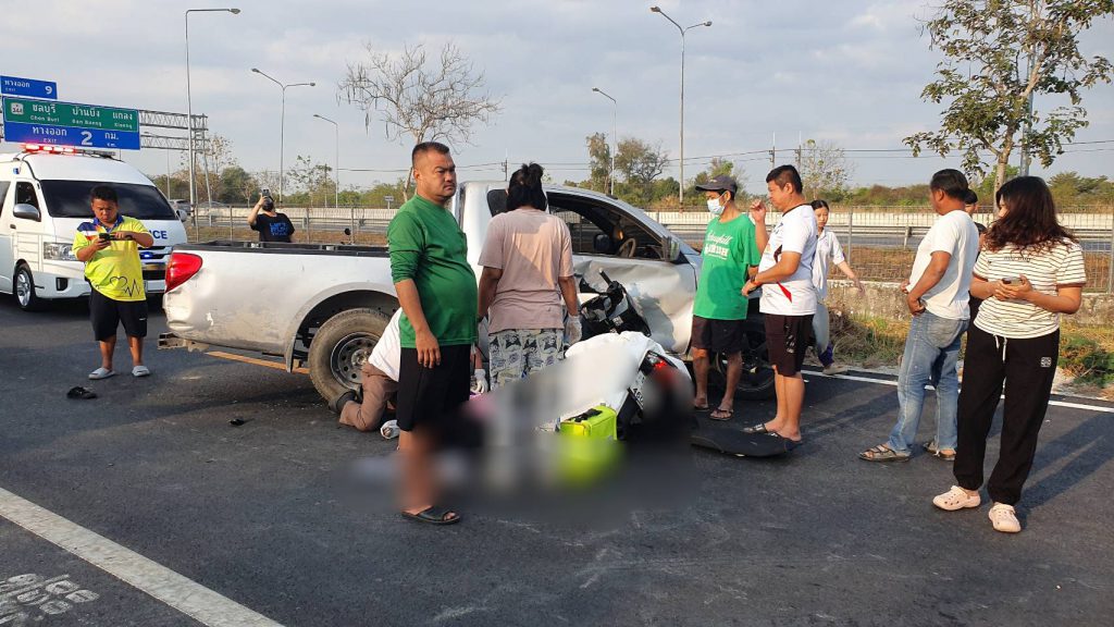 เมื่อเวลา 07.50 น. วันที่ 3 กุมภาพันธ์ ร.ต.ท.อลงกร เทียนประเสริฐ รอง สว.(สอบสวน) สภ.เมืองชลบุรี รับแจ้งเหตุรถชนกันบนถนนเลียบมอเตอร์เวย์ ขาเข้าเมืองชลบุรี หมู่ 5 ต.นาป่า อ.เมือง จ.ชลบุรี จึงรุดตรวจสอบพร้อมแพทย์เวรจาก โรงพยาบาลชลบุรี และเจ้าหน้าที่กู้ภัยไตรคุณธรรม