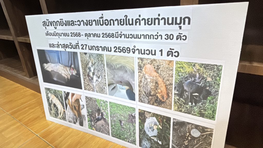 องค์กรระบุว่า ได้รับร้องเรียนจากประชาชนว่าช่วงกลางปี 2568 ต่อเนื่องถึงต้นปี 2569 มีสุนัขทั้งมีเจ้าของและสุนัขจรจัดในพื้นที่ค่าย ถูกวางยาและถูกยิงตายรวมราว 20–30 ตัว โดยผู้ถูกร้องเรียนเป็นตำรวจชั้นประทวนรายหนึ่ง ซึ่ง ยังอยู่ในขั้นกล่าวหาและสอบข้อเท็จจริง