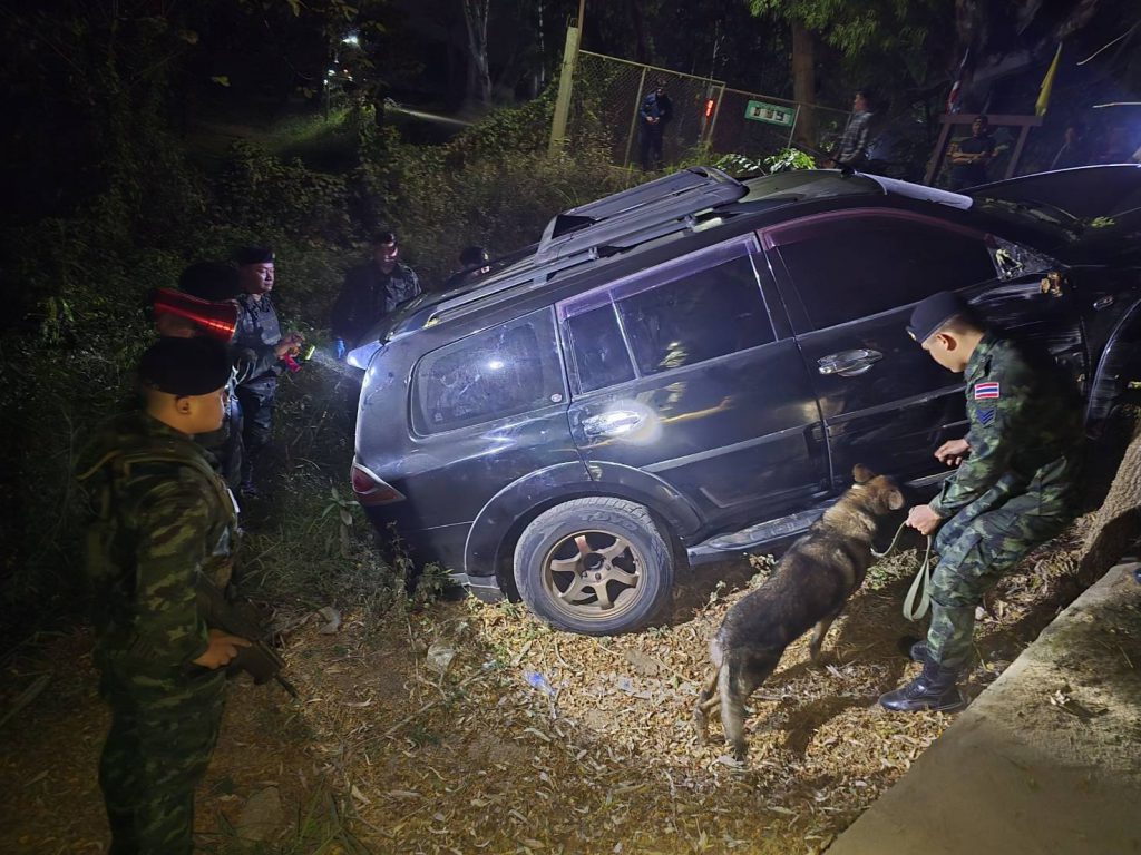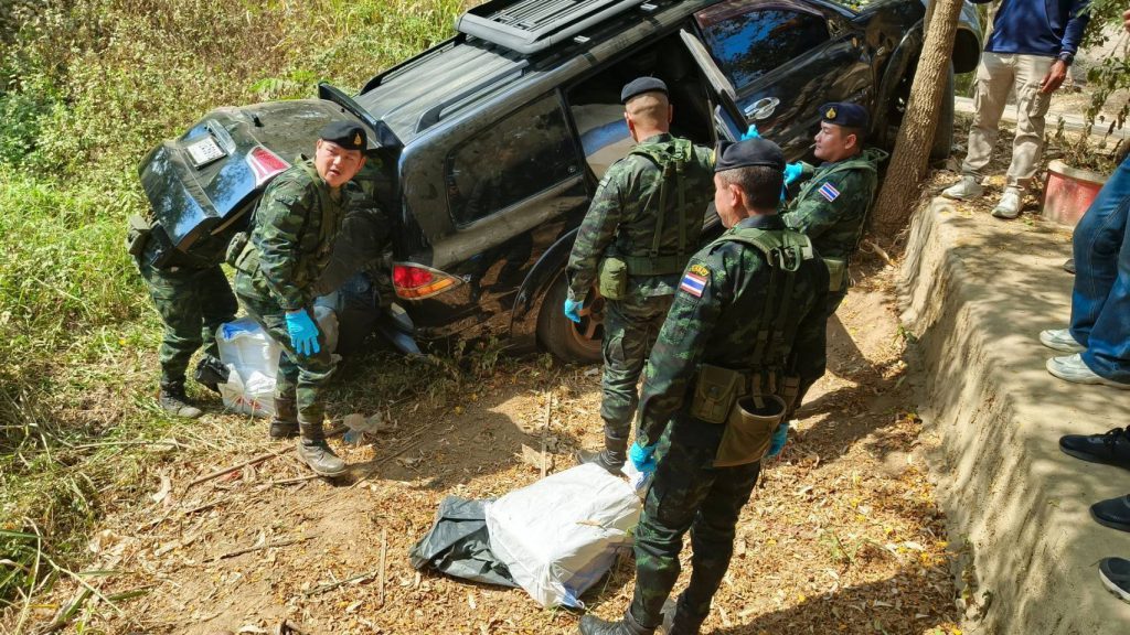 เมื่อเวลา 01.00 น. วันที่ 9 กุมภาพันธ์ 2569 เจ้าหน้าที่ทหาร ร้อย.ม.3 ฉก.ทัพเจ้าตาก กองกำลังผาเมือง สนธิกำลังร่วมกับชุดปฏิบัติการ ร้อย.คทร. และชุดปฏิบัติการสุนัขทหารที่ 10 ตั้งจุดตรวจจุดสกัดแบบไม่ประจำที่ เพื่อป้องกันและสกัดกั้นการลักลอบลำเลียงยาเสพติด บริเวณถนนพื้นที่หมู่เหมืองแดงใต้ หมู่ 1 ตำบลแม่สาย อำเภอแม่สาย จังหวัดเชียงราย ใกล้แนวชายแดนไทย–เมียนมาระหว่างปฏิบัติหน้าที่ เจ้าหน้าที่พบรถยนต์ต้องสงสัย ยี่ห้อมิตซูบิชิ ปาเจโร่ สีดำ แบบ 7 ที่นั่ง ป้ายทะเบียนกรุงเทพมหานคร ขับมุ่งหน้าเข้าพื้นที่จุดตรวจ ก่อนถึงด่านประมาณ 500 เมตร ซึ่งเป็นบริเวณฐานปฏิบัติการนเรศวร บก.มว.ม.2 ร้อย.ม.3 ฉก.ทัพเจ้าตาก รถคันดังกล่าวเกิดท่าทีผิดปกติ หักเลี้ยวกลับกะทันหันจนเสียหลักตกลงไหล่ทาง ไม่สามารถขับขึ้นถนนได้จากนั้น บุคคลภายในรถได้เปิดประตูหลบหนีไปกับความมืด