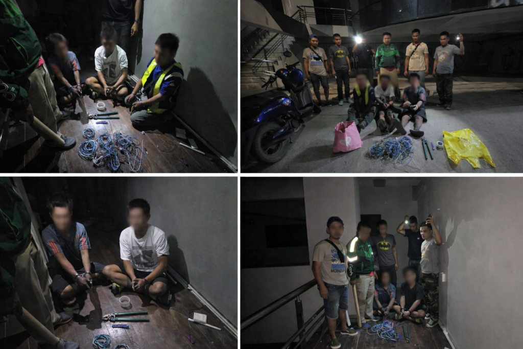 พร้อมของกลาง อาทิ สายไฟฟ้า 8 มัด คีมตัดสายไฟ มีดคัตเตอร์ เทปกาว ไฟฉาย และรถจักรยานยนต์ 2 คัน ไม่ติดแผ่นป้ายทะเบียน โดยจับกุมได้บริเวณอาคารปากซอยพระรามเก้า 51 แขวงสวนหลวง เขตสวนหลวง กรุงเทพมหานคร และต่อเนื่องหอพักย่านซอยพัฒนาการ 20