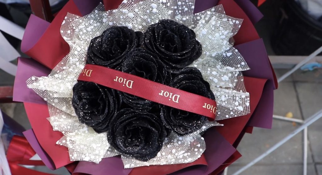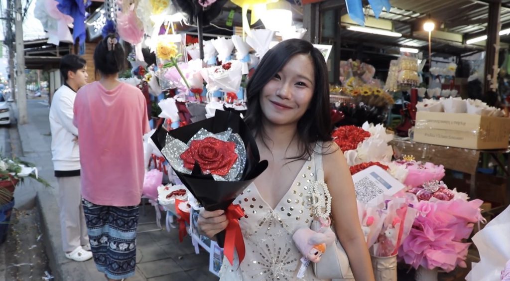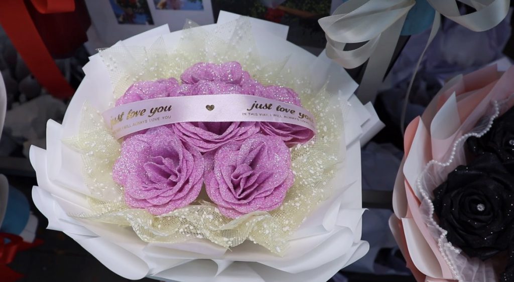 โดยเฉพาะร้าน “ดอกฝ้าย” ซึ่งภายในร้านพนักงานต่างเร่งมือจัดทำออเดอร์ช่อดอกกุหลาบกลิตเตอร์อย่างคึกคัก ช่อดังกล่าวใช้ริบบิ้นขึ้นรูปเป็นดอกกุหลาบ ตกแต่งด้วยผงกลิตเตอร์หรือกากเพชร เพิ่มความแวววาว สะท้อนแสง ทำให้ดูโดดเด่น หรูหรา และเป็นที่นิยมอย่างมากในกลุ่มลูกค้า