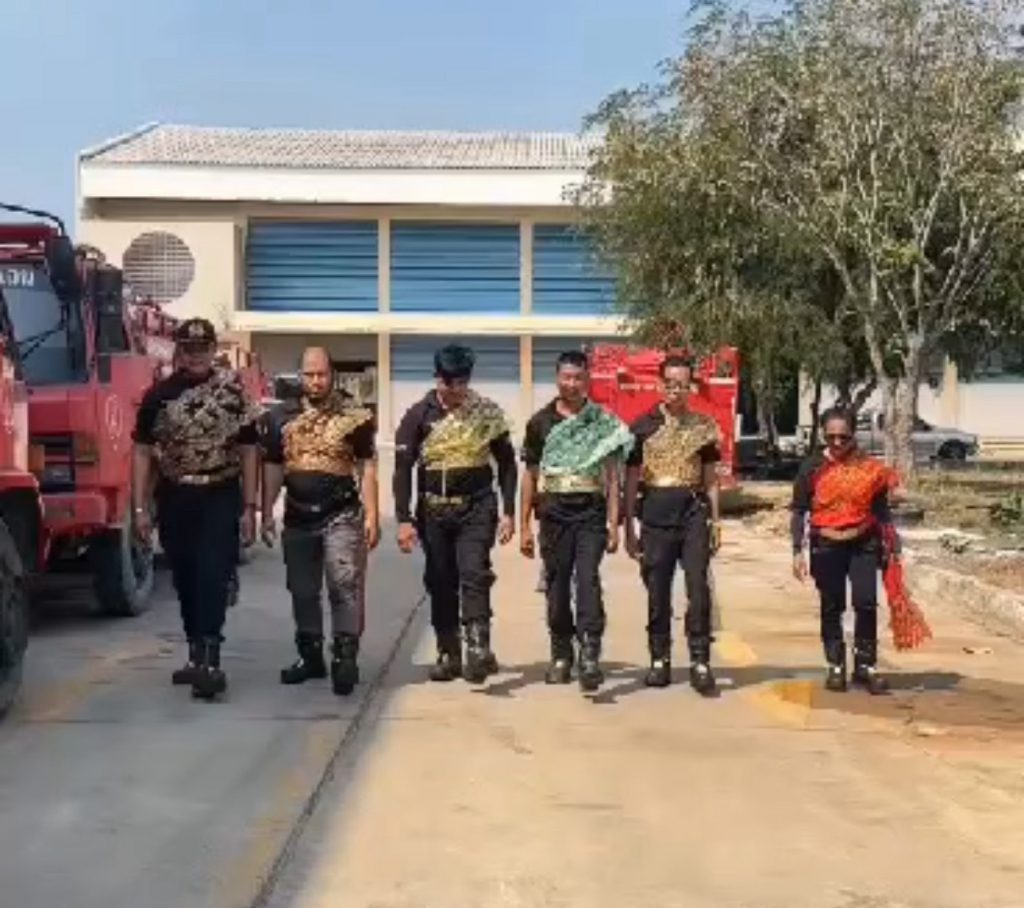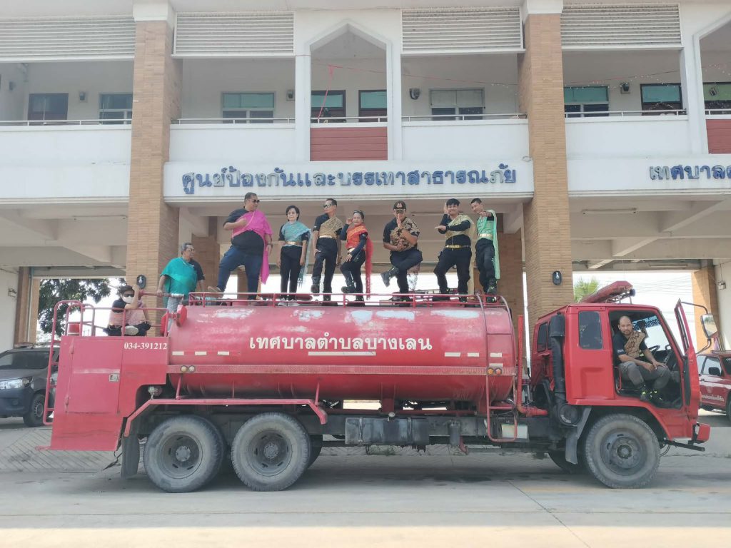 เจ้าหน้าที่ ป้องกันและบรรเทาสาธารณะภัย เทศบาลตำบล บางเลน จ.นครปฐม สวมชุดไทย พร้อมประจำการอยู่บนรถ เพื่อปฎิบัติงาน และสร้างรอยยิ้มให้กับพนักงาน เป็นการทำงานให้มีความสุข
