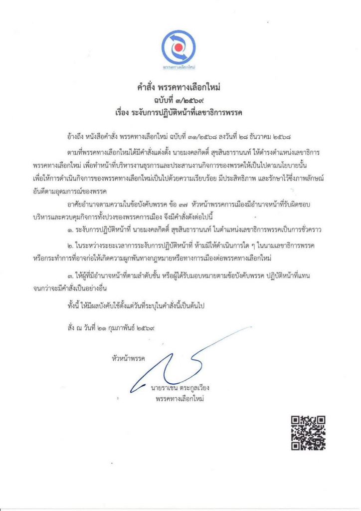 พรรคทางเลือกใหม่มีมติ สั่งพักงาน “เต้ พระราม 7” (มงคลกิตติ์ สุขสินธารานนท์) จากการปฏิบัติหน้าที่ทุกตำแหน่ง พร้อม ห้ามเคลื่อนไหวหรือแสดงตนในนามพรรค โดยให้เหตุผลว่าเป็นมาตรการเพื่อ รักษาภาพลักษณ์ของพรรค และสร้างความมั่นใจต่อสาธารณะท่ามกลางสถานการณ์ทางการเมืองที่กำลังร้อนแรง