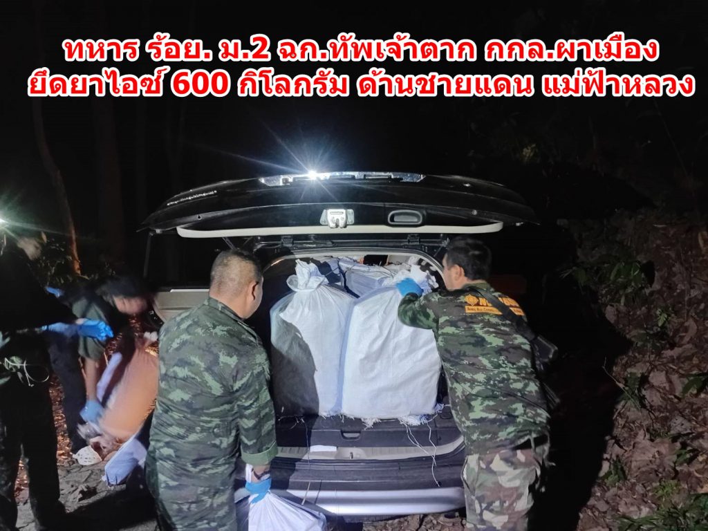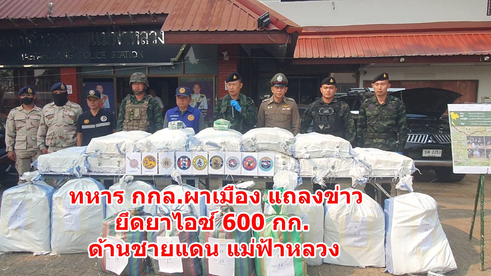 กองกำลังผาเมืองแถลงผลการตรวจยึดยาเสพติดล็อตใหญ่ หลังสกัดกั้นขบวนการลักลอบขนยาเสพติดบริเวณชายแดน อำเภอแม่ฟ้าหลวง จังหวัดเชียงราย ได้ยาไอซ์จำนวนมหาศาลกว่า 600 กิโลกรัม