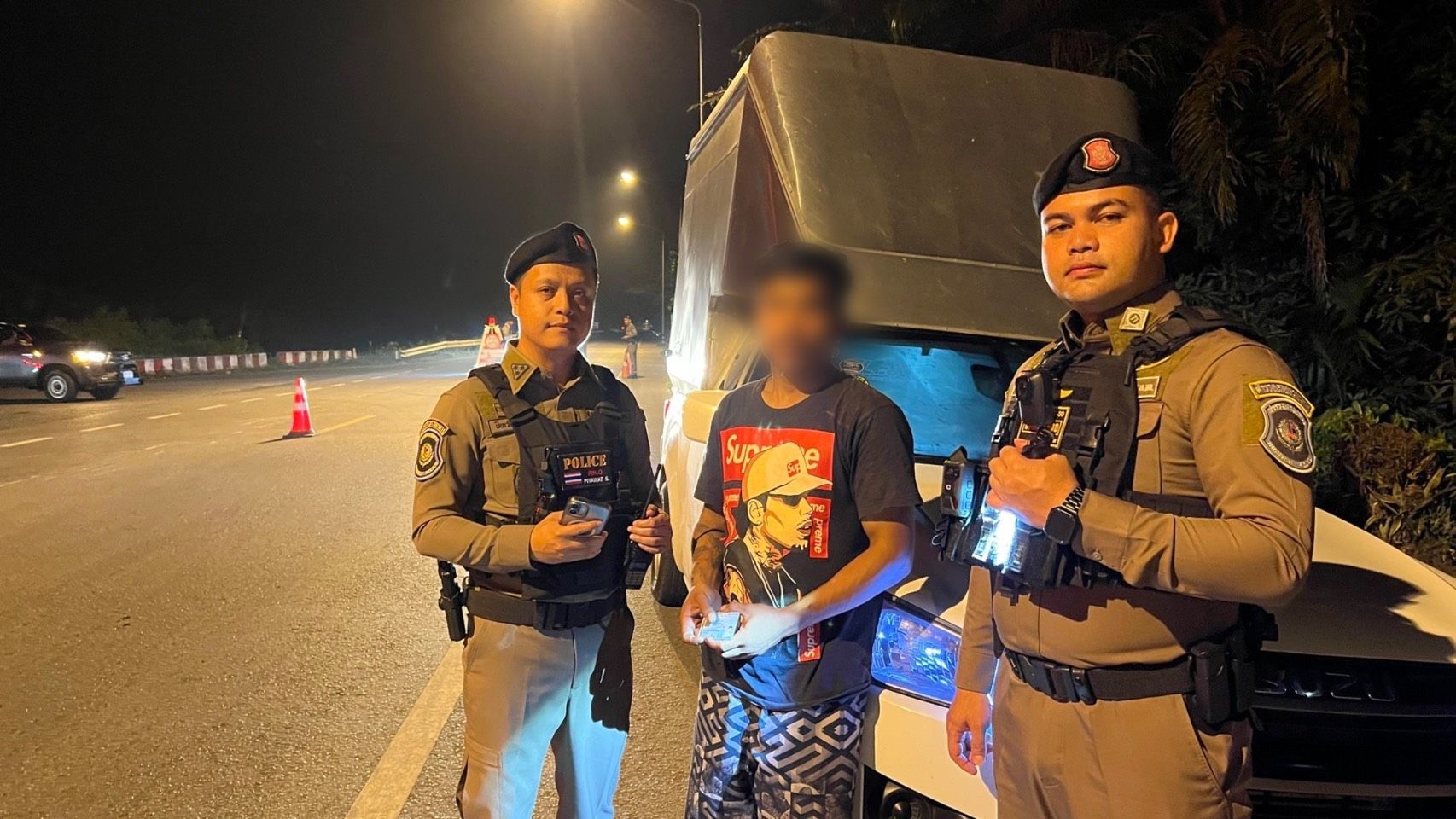 จนกระทั่งเมื่อวันที่ 4 มีนาคม 2569 เวลาประมาณ 20.30 น.เจ้าหน้าที่ตำรวจชุดจับกุม ได้ปฏิบัติหน้าที่ตั้งจุดตรวจอยู่บริเวณที่เกิดเหตุ พบผู้ถูกจับนี้ขับขี่รถยนต์กระบะตู้ทึบผ่านมา แสดงท่าทางมีพิรุธต้องสงสัย เจ้าหน้าที่ตำรวจจึ่งได้สั่งให้หยุดรถเพื่อทำการตรวจสอบ พบเป็นบุคคลตามหมายจับข้างต้น สอบถามผู้ต้องหารับว่าเป็นบุคลตามหมายจับดังกล่าวจริง และไม่เคยถูกจับกุมตัวตามหมายจับดังกล่าวมาก่อน เจ้าหน้าที่ตำรวจชุดจับกุมจึงได้จับกุมตัวผู้ต้องหานี้นำส่งศาลจังหวัดสุพรรณบุรีเพื่อดำเนินการตามกฎหมายต่อไป