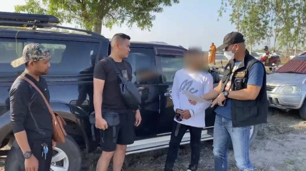 เข้าจับกุมตัว นายชิตณรงค์ หรือ “ชิด” อายุ 43 ปี ชาวตำบลฟ้าห่วน อำเภอค้อวัง จังหวัดยโสธร ได้ที่บริเวณ งานประเพณีบุญบั้งไฟ จุดจอดรถริมถนนกลางทุ่งนา บ้านคูเมือง ตำบลคูเมือง อำเภอมหาชนะชัย จังหวัดยโสธร