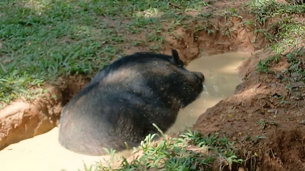 ส่วนตัวที่ยังอยู่ในวัดชื่อว่าอู๊ดอู๊ด เพศเมีย เลี้ยงมาตั้งแต่ตัวเล็กๆ ปัจจุบันมีอายุกว่า 5 ปีเศษแล้ว น้ำหนักเพิ่มขึ้นกว่า 100 กิโลกรัม