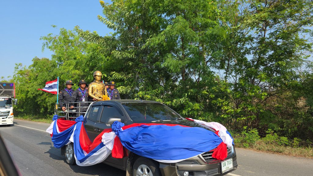 ภายในขบวนยังมีรถแห่นำหน้า พร้อมกลุ่มชาวบ้านร่วมฟ้อนรำต้อนรับ ทำให้การเคลื่อนย้ายรูปปั้นกลายเป็นภาพของการแสดงความเคารพและรำลึกถึงทหารผู้เสียสละ