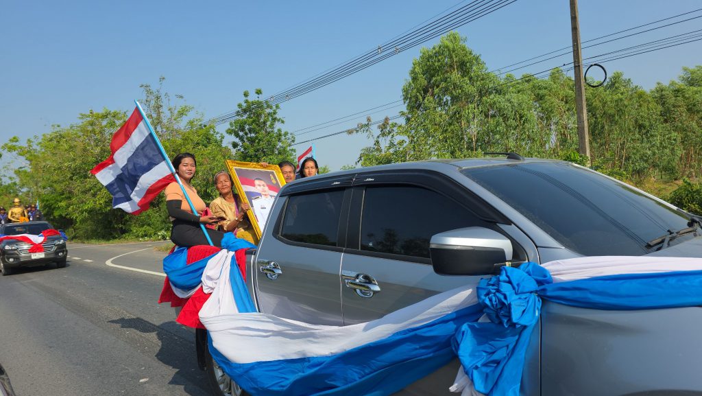 บรรยากาศในพื้นที่ ต.ตาจง อ.ละหานทราย จ.บุรีรัมย์ คึกคัก เมื่อชาวบ้านจำนวนมากออกมาโบกธงชาติไทยริมถนน เพื่อต้อนรับขบวนอัญเชิญรูปปั้นจำลองของ ร.ต.ธีรยุทธ กระจ่างทอง ทหารที่เสียชีวิตจากเหตุปะทะบริเวณชายแดนไทย–กัมพูชา เมื่อวันที่ 29 กรกฎาคม 2568 หลังครอบครัวสร้างรูปปั้นไว้เป็นอนุสรณ์ประจำบ้าน
