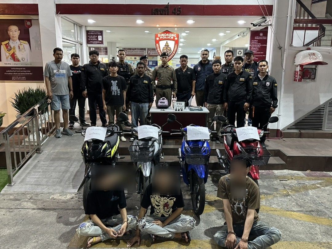 โดยมี พ.ต.ท.ประวิทย์ กองชุมพล สว.สส.สน.ดินแดง พร้อมเจ้าหน้าที่ชุดสืบสวนที่ 2 ร่วมกันแถลงผลการจับกุมเครือข่ายลักทรัพย์รถจักรยานยนต์