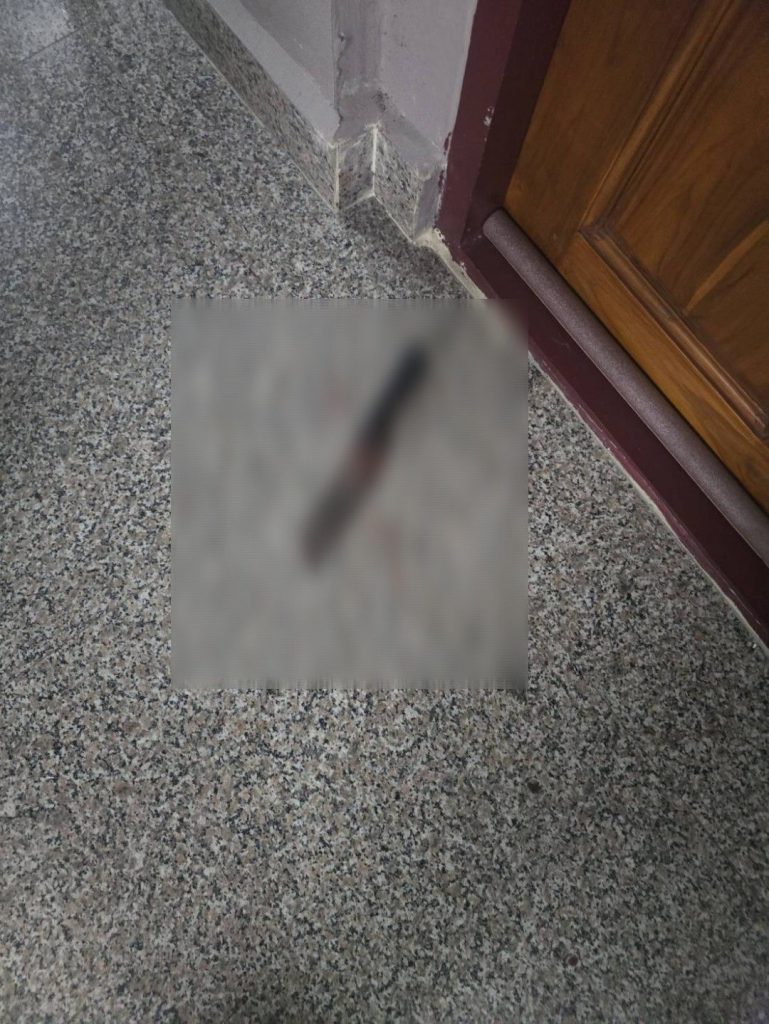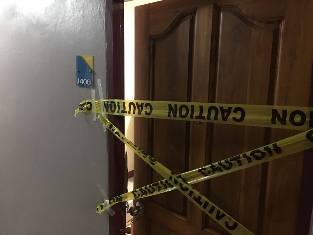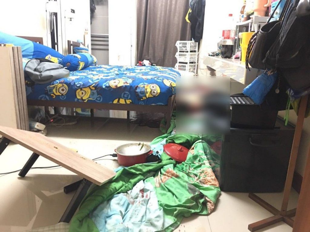 ชาวจ.พิษณุโลก สภาพนอนคว่ำหน้าจมกองเลือดไม่สวมเสื้อ นุ่งกางเกงขาสั้นบ็อกเซอร์ลายพราง มีบาดแผลถูกของมีคมแทงบริเวณลำคอนอนเสียชีวิต ใกล้กันพบอาวุธมีดทำครัว 1 เล่มตกอยู่บริเวณหน้าประตูห้องคาดว่าเป็นอาวุธที่ใช้ก่อเหตุ และพบข้าวของภายในห้องกระจัดกระจายเกลื่อน เจ้าหน้าที่จึงเก็บไว้เป็นหลักฐาน นอกจากนี้ ยังมีผู้ได้รับบาดเจ็บ 1 ราย ทราบชื่อว่า นางสาวธัญรัตน์ อายุ 28 ปี ชาว จ.สกลนคร ซึ่งเป็นแฟนสาวของผู้เสียชีวิต ถูกอาวุธมีดแทงที่ขาได้รับบาดเจ็บ