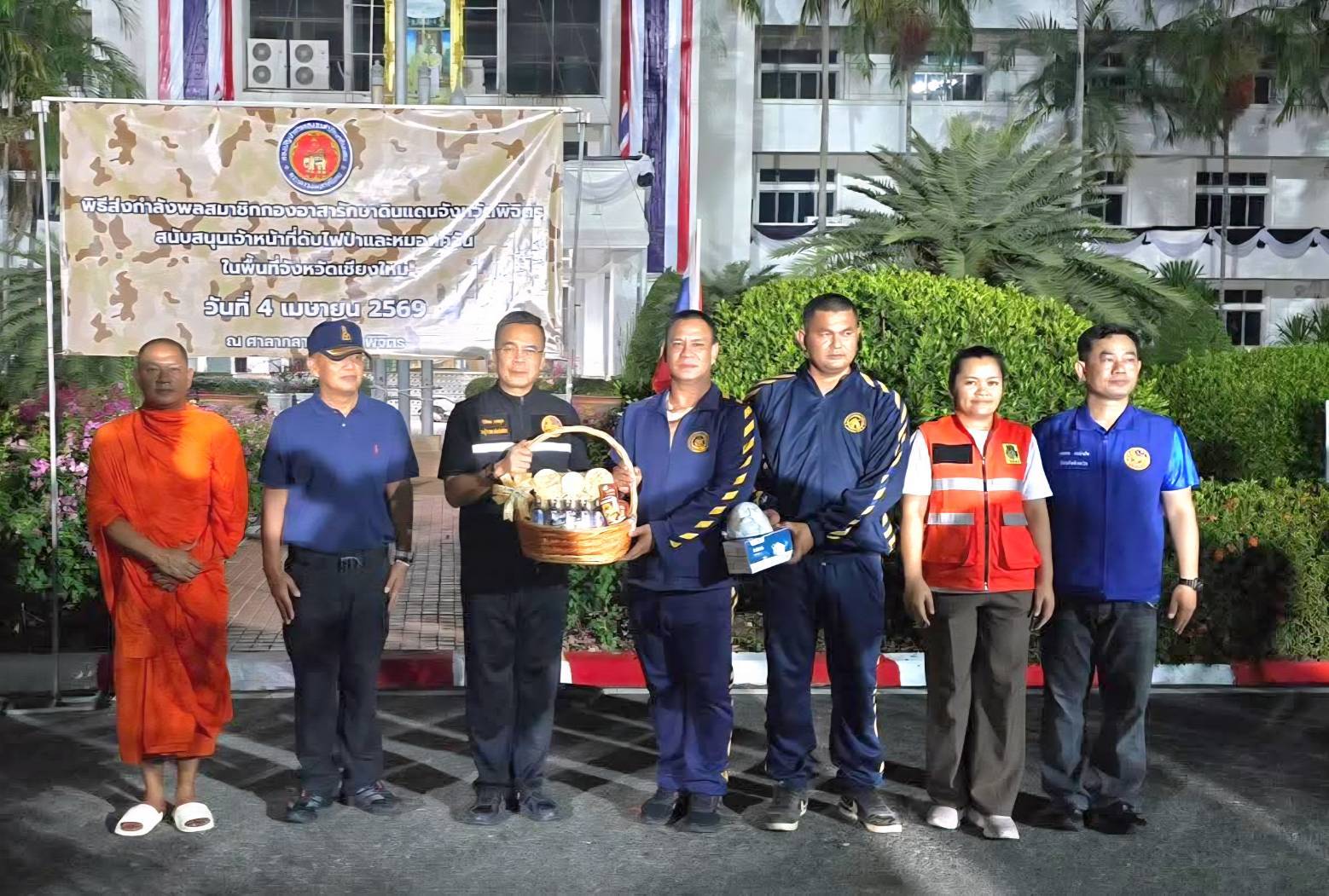เมื่อเวลา 20.00 น.นายกิติพล เวชกุล รองผู้ว่าราชการจังหวัดพิจิตร , นายรณรงค์ สิทธิเขตกรณ์ ปลัดจังหวัดพิจิตร, นายนพดล เขม้นกิจ ป้องกันจังหวัด และหัวหน้าส่วนราชการ ร่วมกันส่งกำลังพล สมาชิกกองกำลังอาสารักษาดินแดนจังหวัดพิจิตร