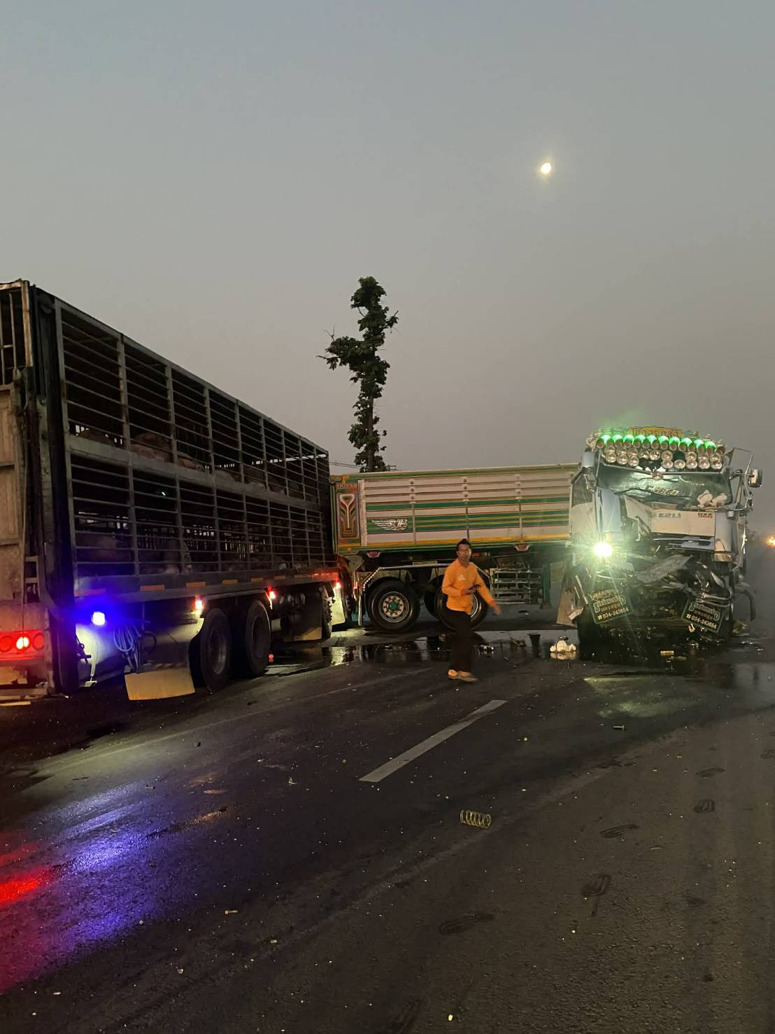 จากการสอบถามทราบว่า ช่วงเกิดเหตุ มีรถบรรทุกพ่วงคันนำหน้าวิ่งอยู่บนถนนบริเวณดังกล่าว และมีรถขนหมูวิ่งตามหลังต่อมารถบรรทุกพ่วงวิ่งตามมาและพยายามแซงรถบรรทุกหมูขึ้นไปจากนั้นก็พุ่งชนท้ายกับรถพ่วง 22 ล้อ ที่วิ่งนำหน้าไปอย่างจังจนรถพ่วงหัวลาก 18 ล้อ หมุนขวางถนนส่วนท้ายเหวี่ยงใส่หน้ารถสอบล้อบรรทุกจนพังยับหวิดตกถนนจนมีผู้ได้รับบาดเจ็บดังกล่าว