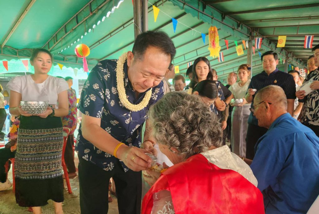 นายสุชาติ ชมกลิ่น ประธานในพิธี ได้นำคณะข้าราชการและประชาชนร่วมประกอบพิธีทางศาสนา สรงน้ำพระ และรดน้ำขอพรผู้สูงอายุ ซึ่งถือเป็นกิจกรรมหลักที่สะท้อนถึงความกตัญญูและความอบอุ่นในชุมชน โดยนายสุชาติย้ำว่า ประเพณีสงกรานต์คือรากฐานของสังคมที่เข้มแข็ง การให้ความสำคัญกับผู้อาวุโสและการใช้ “น้ำ” เป็นตัวเชื่อมความรักความสามัคคี จะช่วยรักษามรดกทางวัฒนธรรมของชาติให้คงอยู่สืบไปนอกจากกิจกรรมรดน้ำผู้สูงอายุแล้ว บรรดาข้าราชการ ผู้นำท้องถิ่น และประชาชนที่มาร่วมงาน ต่างถือโอกาสสำคัญนี้เข้ารดน้ำขอพร นายสุชาติ ชมกลิ่น รัฐมนตรีว่าการกระทรวงทรัพยากรธรรมชาติและสิ่งแวดล้อม เพื่อความเป็นสิริมงคลและแสดงความเคารพรัก ในฐานะที่ท่านเป็นผู้ใหญ่ที่ให้ความสำคัญและดูแลพี่น้องประชาชนในพื้นที่มาโดยตลอด บรรยากาศเป็นไปอย่างเป็นกันเองและเต็มไปด้วยรอยยิ้มไม่เพียงเท่านั้น นายสุชาติ ยังได้แสดงความห่วงใยต่อความเป็นอยู่ของพี่น้องชาวไทย โดยได้ มอบของขวัญจำนวน 4,000 ถุง