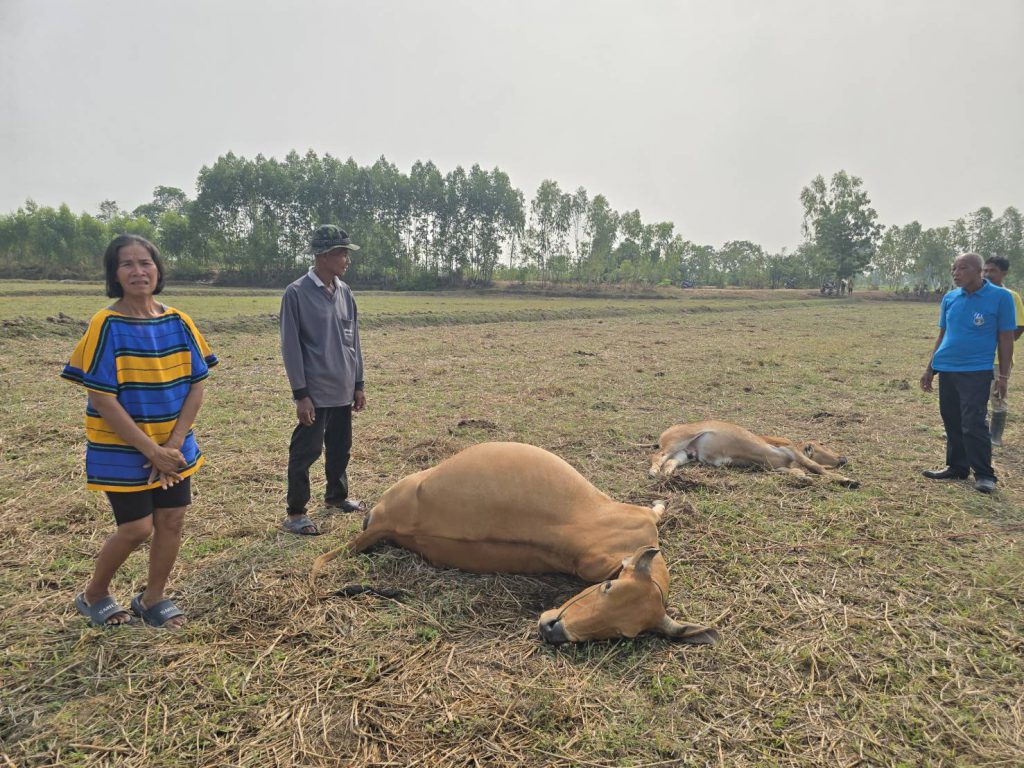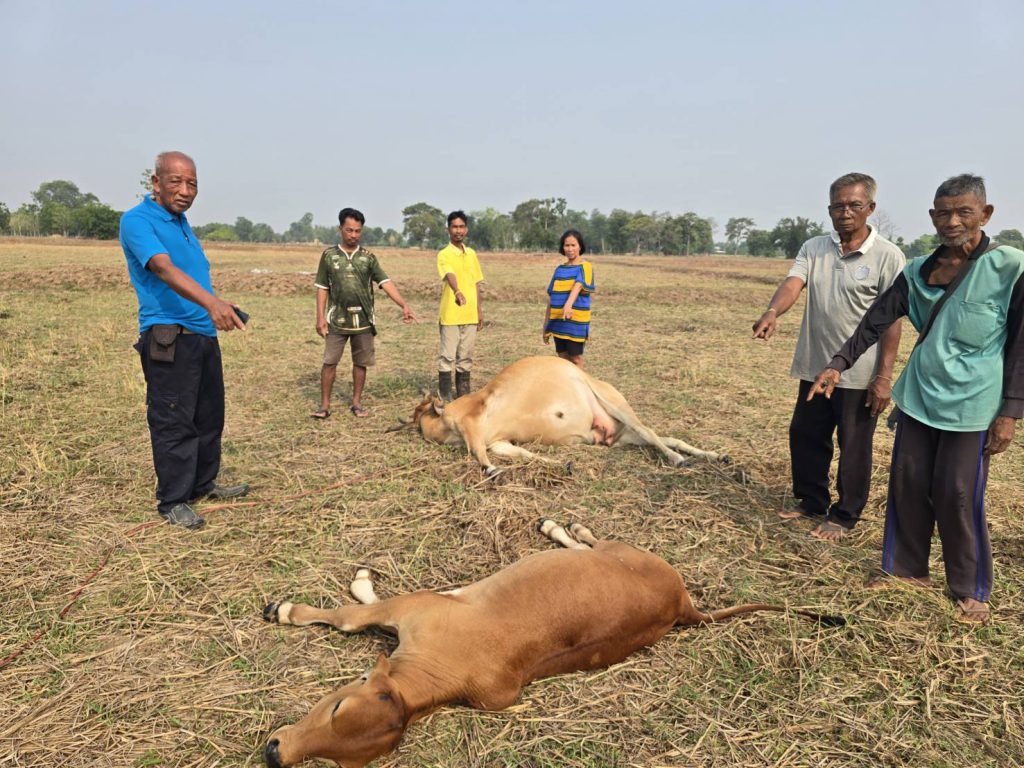 พบนางสมร สุรินทร์ อายุ 57 ปี บ้านเลขที่ 43 หมู่ที่ 11บ้านหนองเสม็ดน้อยพัฒนา ต.ไทยสามัคคี เจ้าของวัวทั้ง 2 ตัวกำลังนั่งลูกบคลำเจ้ารวย กับเจ้ารุ่งเรือง วัวสองแม่ลูกอายุ 5 ปีกับ 2 เดือนที่นอนตายอยู่บนพื้นดินด้วยความเสียใจ